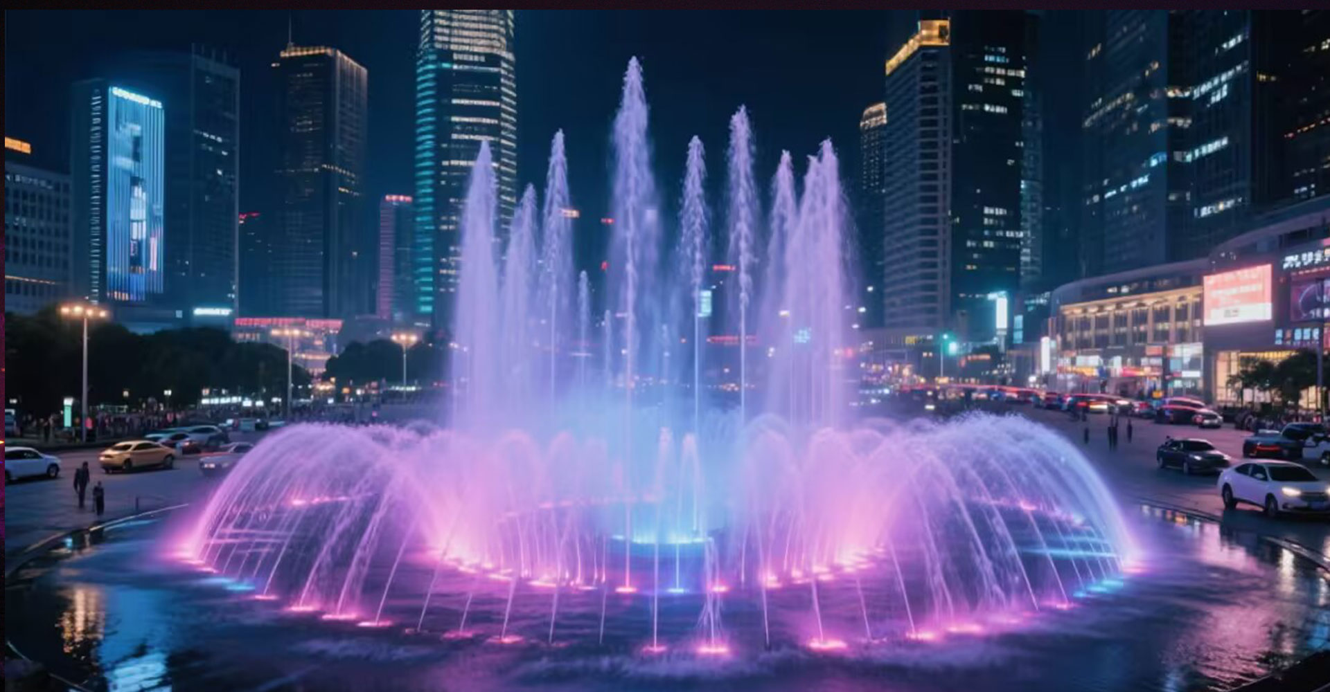 个性化水艺喷泉梦幻的水雾变幻着各种各样的造型,更有绚丽多姿的灯光