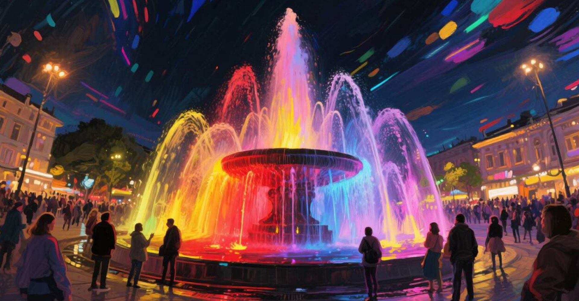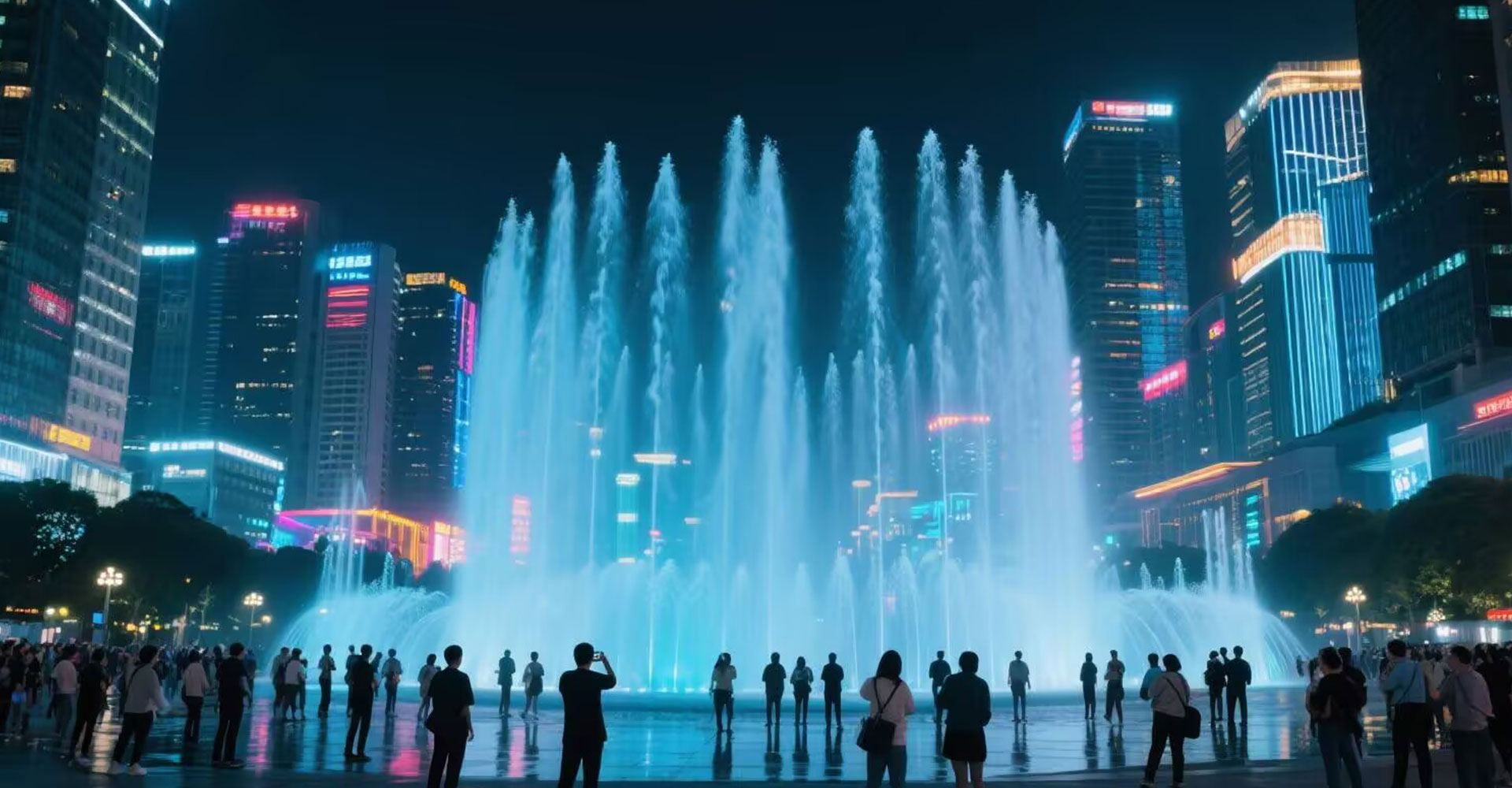 喷泉随着节奏一会儿低涌,一会儿高喷