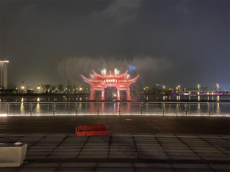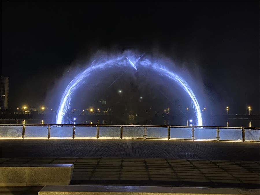 水幕电影是通过高压水泵和特制水幕发生器,将水自下而上,高速喷出,雾化后形成扇形“银幕”,由专用放映机将特制的录影带投射在“银幕”上,形成水幕电影。当观众在观摩电影时,扇形水幕与自然夜空融为一体,当人物出入画面时,好似人物腾起飞向天空或自天而降,产生一种虚无缥缈和梦幻的感觉,令人神往。水幕电影投影机由机械装置、控制支架、通讯口、软件、时间信号界面及DMX512接口组成。该投影机的发动机通过光学传感控制,精度高,其控制方法有三种:编程控制、直接控制和实用程序控制。水幕高达20余米,宽30-50米,各种VCD光盘或水幕专用影片均可在水幕上播放,影视效果奇特、新颖并是极佳的广告宣传工具,各种广场及阔旷的水面均可安装水幕电影。
